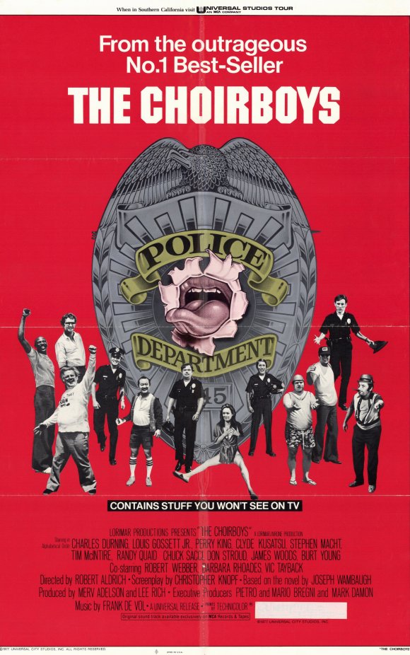 “The Choirboys” opened just before Christmas 1977 and quickly sank like a stone. Vincent Canby’s New York Times review described the film as “designed for people who don’t read much, [though] it can be followed only by someone who has some familiarity with the book. However, anyone who liked the book will probably be appalled by the movie. Which is about as close as “The Choirboys” ever gets to “Catch 22.” It has never been released on DVD (I rented my VHS copy at Video Room) though it was available, briefly, on Netflix Instant, before mysteriously disappearing. (I intend to find out why; given that vast streams of Netflix movies are ignored, low demand could not have been the only reason).