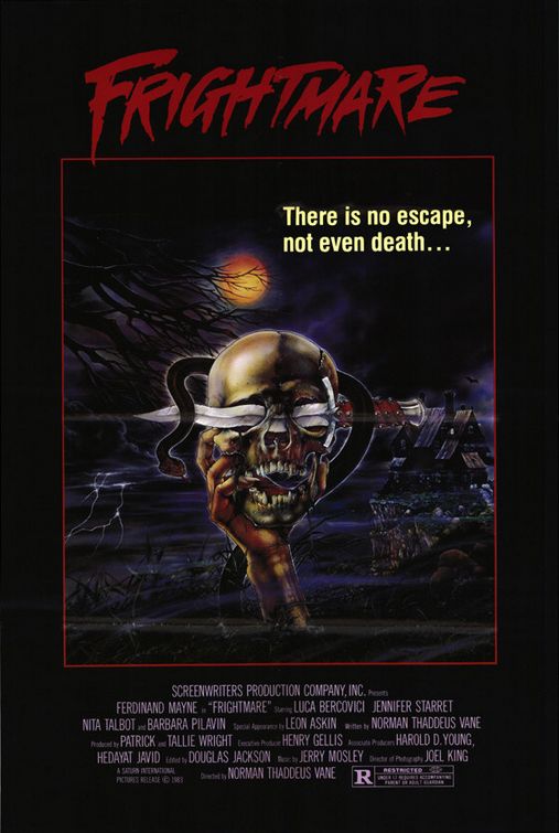 “Frightmare” is the only movie Vane directed that is available on Netflix. A Vincent Price-like horror actor (Ferdinand Mayne) kicks the bucket; a couple of smarmy film students (among them Jeffrey Combs, who would later star in “Re-Animator”) steal his corpse, and–in a particularly schizoid sequence–eat, converse and even waltz with the cadaver. “Frightmare” then turns into a standard slasher pic, albeit one with a wry twist; instead of teens being punished for lust, they are punished for grave-robbing. Only one of the murders is innovative: a girl gets impaled by a flying tombstone. The rest is pretty run-of-the-mill stuff; a beheading, an asphyxiation, a disembowelment. Mayne gives it his hammy all, but actual Vincent Price vehicles are more fun. That said, the movie seems to be a cult favorite among horror fans (including Thrower). And according to Vane, Roger Ebert gave the film a decent review (though I can’t find it on his web site, nor in the Chicago Tribune archives).