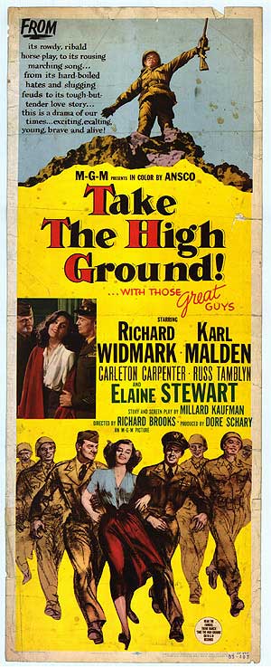 “Take the High Ground!” is a sort of G-rated “Full Metal Jacket,” in which a stern but fair drill sergeant (Richard Widmark) grills and then bonds with his Army underlings. The movie (which I watched on a grainy, crackly DVD I ordered off of Robert’s Hard-to-Find Videos) is only notable for another sweet-faced appearance from a young Russ Tamblyn.
