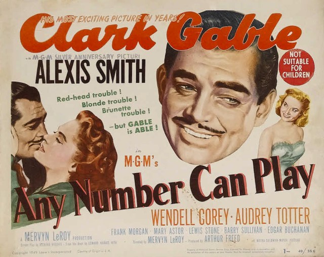 Unfortunately, none of that anger or passion seeps into “Any Number Can Play.” It’s a decent but cluttered drama, with Clark Gable as a beloved casino owner who, in one night, finds out he has a life-threatening disease (made worse by stress), resists the temptations of several would-be mistresses, foils his sneaky, debt-ridden brother’s plan to clean the casino out of millions and mends relations with his resentful teenage son. It’s well-acted and well-paced but rather contrived. I rented this from Video Room.