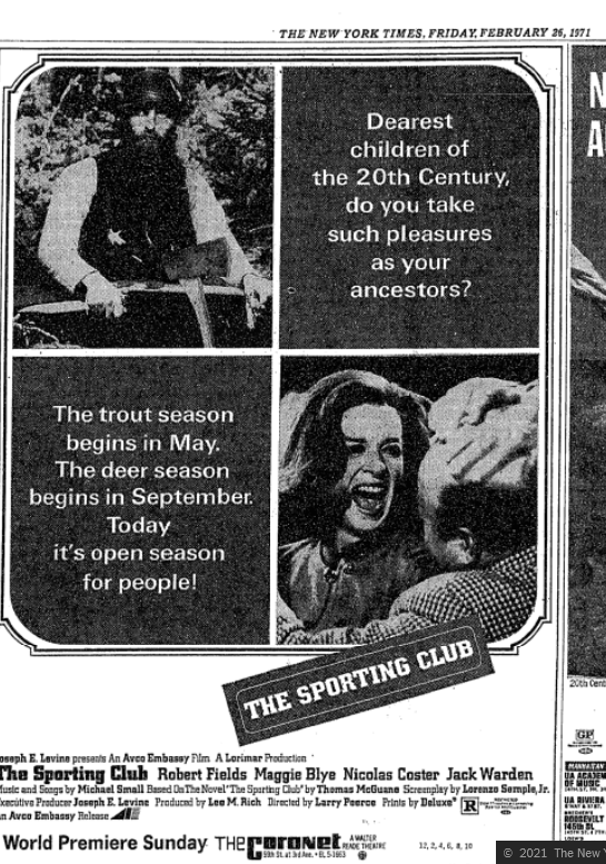 The most glaring exception is “Sporting Club,” a film that Peerce himself disowns. Despite a riveting performance from Jack Warden, it is glum yet crass, dreary yet chaotic, murky about its own satiric intent, and fixated on privileged characters who relish in pointless sadism. It reminded me of Robert Altman’s similarly reviled, equally garrulous and brutish “Quintet.” Nonetheless, it’s one of two Peerce films that are notably hard to find, and for that reason alone, it has a certain mystique.